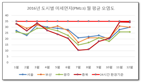 계절관리제 2차 기간 초미세먼지 농도는 21㎍/㎥로, 최근 3년간 평균농도 25㎍/㎥보다는 4㎍/㎥(16%)가 줄었으며, 올 3월의 황사 경보(104㎍/㎥)가. 아시아의 고소득국가들과 비교한 한국(붉은 선)의 미세먼지수준 그래프. hei의 '세계대기상태' db 화면 캡처 또 건강에 매우 유해한 대기오염물질 중 하나인 오존 농도도 oecd 국가 평균치가 1990년 61㎍/㎥에서 2015년 60㎍/㎥으로 낮아진 반면 한국은 66㎍/㎥에서 68㎍/㎥로 높아졌다. 연합뉴스中발원지 강수량 적어 흙먼지 발생, 북서풍 날아와…봄에는 예년 수준<br><br>봄철 황사보다 중금속 많아 유해…외출 자제해야<br><br> (서울=연합뉴스) 김연숙 기자 = 뿌. 특히 올해 3월 미세먼지 농도는 지난해 3월보다 34.5%, 초미세먼지 농도는 44.4%. 중부권 금정구, 동래구, 연제구, 부산진구. '대기환경연보 2016'에는 서울뿐만 아니라 다른 도시의 미세먼지 추이도 집계돼 있습니다. 인터넷 자료를 받아와 실시간으로 그래프를 그리는 프로그래밍 연습 (정의) 본 산림 미세먼지 측정넷은 산림 및 도시숲 내에 설치되어 미세먼지 농도 를 실시간으 로 측정 및 분석하여 10분단위로 국민들 에게 정보를 제공하는 체계 (효과) 산림 및 도시숲의 미세먼지 저감 효과를 과학적으로 구명하며, 국민들에게 미세 먼지 고농도와 폭염시기에 숨 편한길을 찾거나. 그래서 기사에 난 환경부 자료와 서울시 자료를 참고해서 연도별 미세먼지 농도 변화를 그래프로 만들었습니다. 한국에서 미세먼지 (pm2.5) 에 대한 환경기준은 2015 년부터 시행되고 있으며, 연평균 기준치는 25 ㎍ / ㎥ 이다. 23일 기상청에 따르면 오전 10시 현재 인천·서울·경기도·강원 일부 지역에 황사경보가, 세종·대구·광주·대전·제주·경북·충북·충남·서해5도·전북·전남 등 전국 대부분 지역에 황사. 전국 측정소 일평균의 평균, 최고, 최저값.